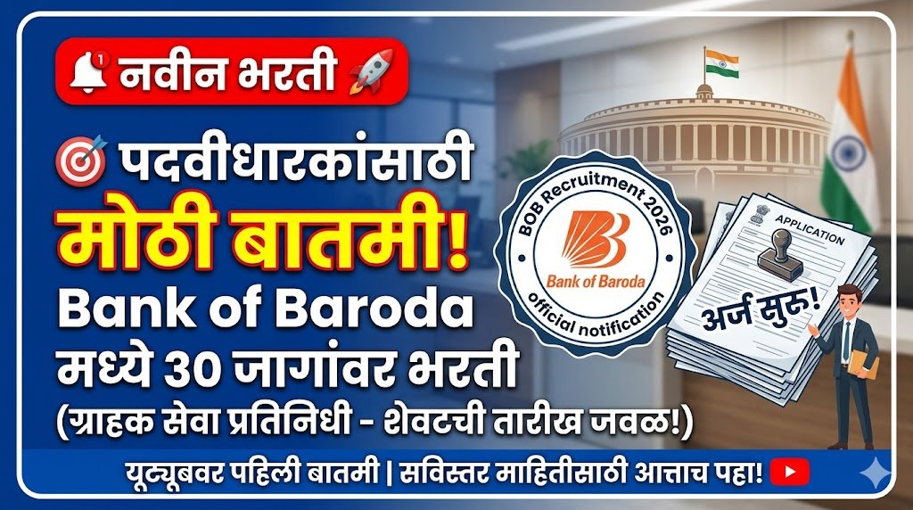 рд╕рд░рдХрд╛рд░реА рдмрдБрдХреЗрдд рдиреЛрдХрд░реА рдХрд░рдгреНрдпрд╛рдЪреА рдЗрдЪреНрдЫрд╛ рдЕрд╕рдгрд╛рд▒реНрдпрд╛ рдкрджрд╡реАрдзрд░ рдЙрдореЗрджрд╡рд╛рд░рд╛рдВрд╕рд╛рдареА рдЖрдирдВрджрд╛рдЪреА рдмрд╛рддрдореА рдЖрд╣реЗ. Bank of Baroda (BOB) рдЕрдВрддрд░реНрдЧрдд тАЬрдЧреНрд░рд╛рд╣рдХ рд╕реЗрд╡рд╛ рдкреНрд░рддрд┐рдирд┐рдзреАтАЭ рдкрджрд╛рд╕рд╛рдареА рднрд░рддреА рдкреНрд░рдХреНрд░рд┐рдпрд╛ рд╕реБрд░реВ рдЭрд╛рд▓реА рдЖрд╣реЗ. рдПрдХреВрдг 30 рд░рд┐рдХреНрдд рдЬрд╛рдЧрд╛рдВрд╕рд╛рдареА рдкрд╛рддреНрд░ рдЙрдореЗрджрд╡рд╛рд░рд╛рдВрдХрдбреВрди рдЕрд░реНрдЬ рдорд╛рдЧрд╡рд┐рдгреНрдпрд╛рдд рдпреЗрдд рдЖрд╣реЗрдд. рд╣реА рднрд░рддреА рдкреНрд░рдХреНрд░рд┐рдпрд╛ рдкреВрд░реНрдгрдкрдгреЗ рдСрдирд▓рд╛рдИрди рдкрджреНрдзрддреАрдиреЗ рд╣реЛрдгрд╛рд░ рдЕрд╕реВрди рдЕрд░реНрдЬ рдХрд░рдгреНрдпрд╛рдЪреА рд╢реЗрд╡рдЯрдЪреА рддрд╛рд░реАрдЦ 12 рдореЗ 2026 рдЖрд╣реЗ.
